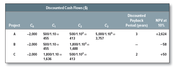 Occasionally companies discount the cash flows before they compute the payback period. The discounted cash flows for our three projects are as follows: