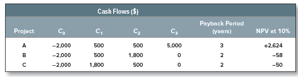 Now look at how rapidly each project pays back its initial investment. With project A, you take three years to recover the $2,000 investment; with projects B and C, you take only two years. If the firm used the payback rule with a cutoff period of two years, it would accept only projects B and C; if it used the payback rule with a cutoff period of three or more years, it would accept all three projects. Therefore, regardless of the choice of cutoff period, the payback rule gives different answers from the net present value rule.