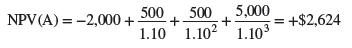 Project A involves an initial investment of $2,000 (C0 = -2,000) followed by cash inflows during the next three years. Suppose the opportunity cost of capital is 10%. Then project A has an NPV of +$2,624: