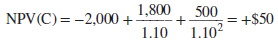 The third project, C, involves the same initial outlay as the other two projects but its first- period cash flow is larger. It has an NPV of +$50:
