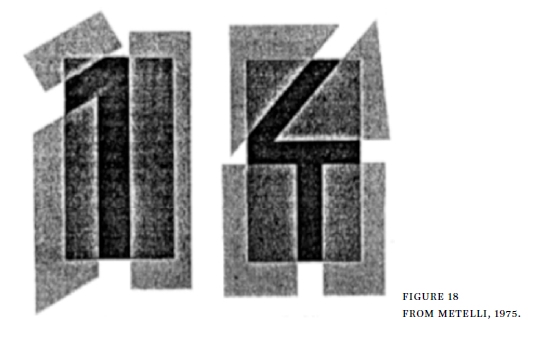 The implications a, b, c, e, and g satisfy Metelli’s conditions for the perceived transparency of opaque co-planar two-dimensional surfaces and account for the first perceptual case. The implication d accounts for the second one. Of course, it has to be combined with other functional connections to explain the difference of the figure/ground relation with respect to the first case, but it is sufficient to make the direction of the common boundary reverse for the numerals to appear on the transparent layer that is completed behind them. Therefore, this perceptual case is an instance of the relation “p V q.” These two groups of implications are distinct strings of the theory that are at variance, which accounts for the alternation between the perceptual cases’ appearances. At the same time they describe the evidence of a perceptual datum. No one can see the stratified figures and the numerals simultaneously, although transparency is still seen if the numerals appear. To account for this observable fact, the theory needs to admit the inclusive disjunction in order to distinguish this kind of case from the proper inconsistency. For example, a perceptual case like the well-known Rubin invertible figure that could violate the asymmetry of boundary requires the exclusive disjunction “p + q,” which means “p or q, but not both.” In such cases, the two alternative appearances are mutually inconsistent, because no feature of the first appears in the second when the switch occurs between them. In contrast to figure 18, the perceptual alternation is now explained by the fact that two sets of implications are inconsistent and describe the alternating prevalence of competing appearances over one another.