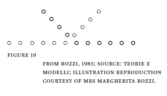The Cartesian propositions can be concatenated to reduce experimental data to known rules or to discover new rules. Bozzi (1985) reconstructs the logic of this procedure using Wertheimer’s grouping factors as example. Wertheimer starts from inducing transformations on a row of equidistant dots. If their distance is altered through translation, the nearer the dots are the more they are grouped together and segregated from the visually more distant dots. At decreasing distances, the perceived unification increases. Therefore, the formula <$u, u = fTJ can be introduced to express that the unitary form $u appears according to the proximity factor F1. One can hypothesize that this factor explains the grouping for each set of visual elements that satisfy proximity. In the figure 19, this factor prescribes that the angular sector on the right should appear as a unitary form against the line that could be formed by the remaining four dots on the right (see also Wertheimer, 1923: 320).