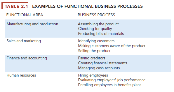 Every business can be seen as a collection of business processes, some of which are part of larger encompassing processes. For instance, uses of mentoring, wikis, blogs, and videos are all part of the overall knowledge management process. Many business processes are tied to a specific functional area. For example, the sales and marketing function is responsible for identifying customers, and the human resources function is responsible for hiring employees. Table 2.1 describes some typical business processes for each of the functional areas of business.