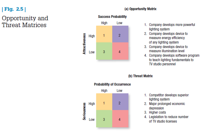 An environmental threat is a challenge posed by an unfavorable trend or development that, in the absence of defensive marketing action, would lead to lower sales or profit. Figure 2.5(b) illustrates the threat matrix facing the TV-lighting-equipment company. The threats in the upper-left cell are major because they have a high probability of occurrence and can seriously hurt the company. To deal with them, the company needs contingency plans. The threats in the lower-right cell are minor and can be ignored. The firm will want to carefully monitor threats in the upper-right and lower-left cells in the event they grow more likely or serious.