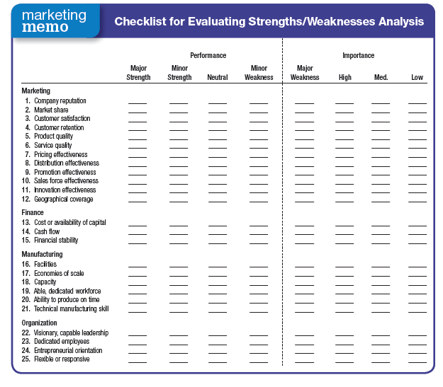 Businesses can evaluate their own strengths and weaknesses by using a form like the one shown in “Marketing Memo: Checklist for Evaluating Strengths/Weaknesses Analysis.” Clearly, the business doesn’t have to correct all its weaknesses, nor should it gloat about all its strengths. The big question is whether it should limit itself to those opportunities for which it possesses the required strengths or consider those that might require it to find or develop new strengths.