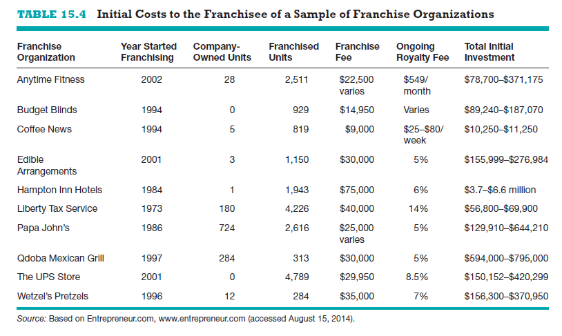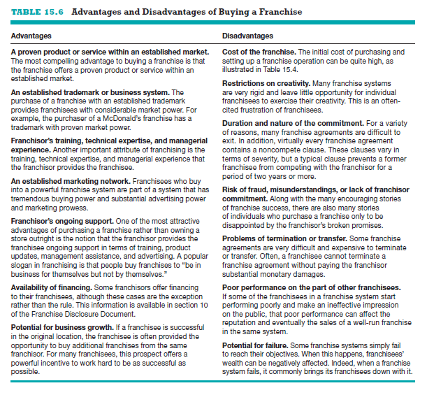 Table 15.6 contains a list of the advantages and disadvantages of buying a franchise.