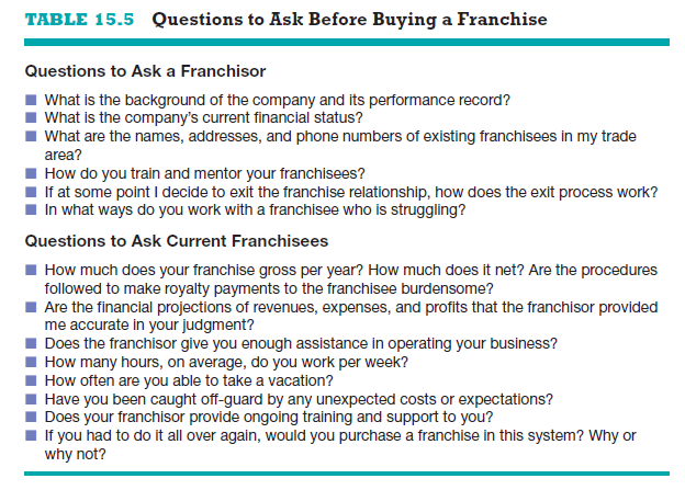 Table 15.5 contains a list of sample questions to ask a franchisor and some of its current franchisees before investing. Potential entrepreneurs can expect to learn a great deal by studying the answers they receive in response to these questions.