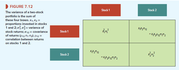 The entries in these diagonal boxes depend on the variances of stocks 1 and 2; the entries in the other two boxes depend on their covariance. As you might guess, the covariance is a measure of the degree to which the two stocks “covary.” The covariance can be expressed as the product of the correlation coefficient p12 and the two standard deviations: