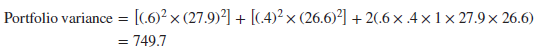 Calculating the expected portfolio return is easy. The hard part is to work out the risk of your portfolio. In the past, the standard deviation of returns was 26.6% for Amazon and 27.9% for Southwest Airlines. You believe that these figures are a good representation of the spread of possible future outcomes. At first you may be inclined to assume that the standard deviation of the portfolio is a weighted average of the standard deviations of the two stocks—that is, (.40 X 26.6) + (.60 X 27.9) = 27.4%. That would be correct only if the prices of the two stocks moved in perfect lockstep. In any other case, diversification reduces the risk below this figure.