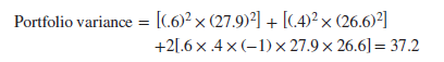 The standard deviation is √37.2 = 6.1%. Risk is almost eliminated. But you can still do better in terms of risk by putting 51.2% of your investment in Amazon and 48.8% in Southwest Airlines. In that case, the standard deviation is almost exactly zero. (Check the calculation yourself.)