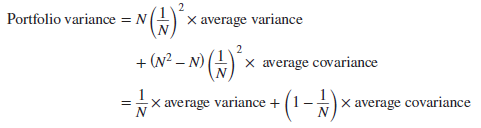 Suppose we are dealing with portfolios in which equal investments are made in each of N stocks. The proportion invested in each stock is, therefore, 1/N. So in each variance box we have (1/N)2 times the variance, and in each covariance box we have (1/N)2 times the covariance. There are N variance boxes and N2 – N covariance boxes. Therefore,