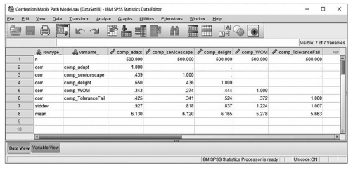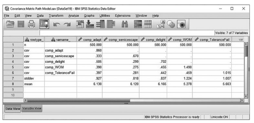 To use a correlation matrix as the input, you need to have the data set up in a very specific format in SPSS. Using our path model example, Figure 5.7 shows the specific format in SPSS if we wanted to use a correlation matrix as the input for the path model. If it is not in this for- mat, AMOS will not be able to read the data. Note that in the first column you need to label it “rowtype_” and the second column “varname_”. The next columns will be your construct names. In the first row will be your sample size, and the next rows will be your correlations between constructs. The next to last row is standard deviation, and the last row is the mean of the construct.