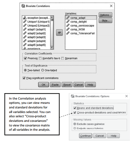 If you are looking for an easy way to find the correlation matrix and covariance matrix along with means and standard deviations for each construct, SPSS has numerous options to find this information. One of the best options is to use the correlation analysis function and ask for additional information. To view a correlation matrix in SPSS, you will go to “Analyze” in the top menu, select “Correlate”, and then select “Bivariate”.You will include the variables you want a correlation matrix for and then hit the “Options” button.You can then select the checkbox of “Means and standard deviations”. The next checkbox of “Cross-product devia- tions and covariances” will give you the covariance matrix.