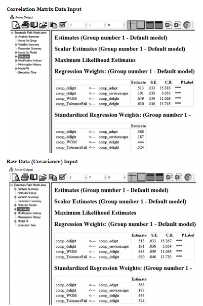Figure 5.9 Comparison of Covariance and Correlation Matrix Input in AMOS