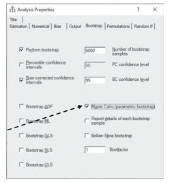 Once you have formatted and saved your summary data, you need to make sure AMOS has the new data file as the input. In the Analysis Properties window, select the “Indirect, direct, and total effects” option again. With the Bootstrap tab, select “Perform Bootstrap” and change the number of bootstraps to 5,000. Select the “Bias-corrected confidence inter- vals” and change the confidence interval to 95. Since you do not have raw data, you also need to select “Monte Carlo (parametric) bootstrap” option. With a Monte Carlo boot- strap, the bootstrap sample’s means, variances, and covariances will match the summary data In essence, it runs a simulation that will match the summary data provided. If you do not select the Monte Carlo option, AMOS will give you an error message and say it cannot run the bootstrap without the raw data. After making these selections, you are ready to run the analysis.The format for the output with the Monte Carlo simulation will look exactly like the output for the mediation test that used the raw data.Thus, you will need to go to the same place in the output to find your results.