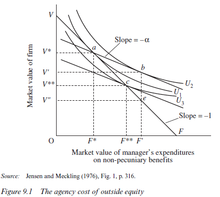 Given the inescapable agency costs of outside finance, Jensen and Meckling explain the existence of outside equity and debt holders primarily by reference to risk-spreading benefits. Selling equity claims to outsiders will reduce the value of the firm and hence the owner-manager’s wealth, but if the benefits of a more widely diversified portfolio outweigh these agency costs, the owner-manager will still prefer to reduce his/her holding. The optimal amount of outside financing will be reached when the marginal benefits from increased diversification equal the marginal agency costs incurred.24
