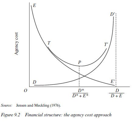 Similarly, as the proportion of bond finance rises and outside equity declines, the agency problems of debt become increasingly serious. Inside- equity holders have greater effort incentives, and bond finance ensures the distribution of cash from successful ventures, but bonds also encourage greater risk taking. This relationship is shown by curve DD’. Total agency costs are minimised at point P on TT.