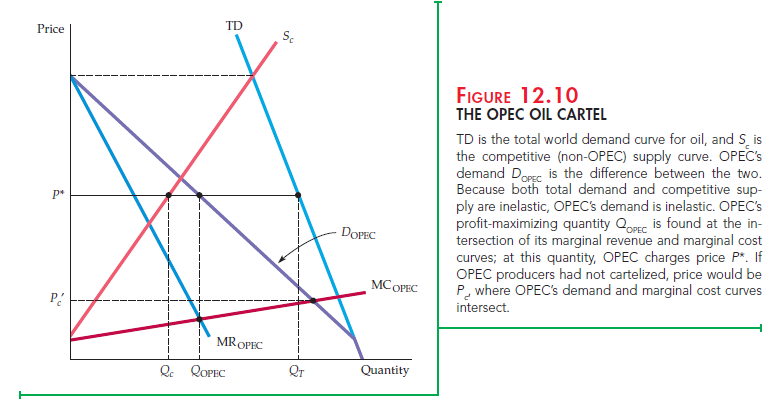ANALYZING OPEC Figure 12.10 illustrates the case of OPEC. Total demand TD is the total world demand curve for crude oil, and Sc is the competitive (non-OPEC) supply curve. The demand for OPEC oil DOPEC is the difference between total demand and competitive supply, and MROPEC is the corresponding marginal revenue curve. MCOPEC is OPEC’s marginal cost curve; as you can see, OPEC has much lower production costs than do non-OPEC producers. OPEC’s marginal revenue and marginal cost are equal at quantity QOPEC, which is the quantity that OPEC will produce. We see from OPEC’s demand curve that the price will be P*, at which competitive supply is Qc.