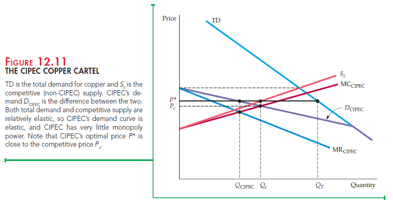 ANALYZING CIPEC Figure 12.11 provides a similar analysis of CIPEC, which consists of four copper-producing countries: Chile, Peru, Zambia, and Congo (formerly Zaire), that collectively account for less than half of world copper production. In these countries, production costs are lower than those of non-CIPEC producers, but except for Chile, not much lower. In Figure 12.11, CIPEC’s marginal cost curve is therefore drawn only a little below the non-CIPEC supply curve. CIPEC’s demand curve DCIPEC is the differ-ence between total demand TD and non-CIPEC supply Sc. CIPEC’s marginal cost and marginal revenue curves intersect at quantity QCIPEC, with the corre-sponding price P*. Again, the competitive price Pc is found at the point where CIPEC’s demand curve intersects its marginal cost curve. Note that this price is very close to the cartel price P*.