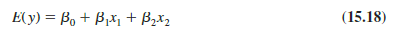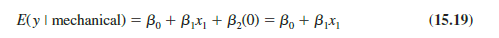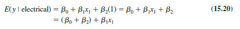 Comparing equations (15.19) and (15.20), we see that the mean repair time is a linear function of x1 for both mechanical and electrical repairs. The slope of both equations is $1, but the y-intercept differs. The y-intercept is β0 in equation (15.19) for mechanical repairs and (β0 + β2) in equation (15.20) for electrical repairs. The interpretation of β2 is that it indicates the difference between the mean repair time for an electrical repair and the mean repair time for a mechanical repair.