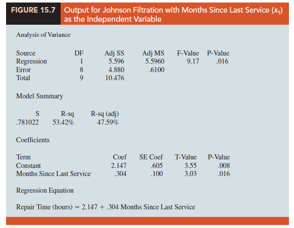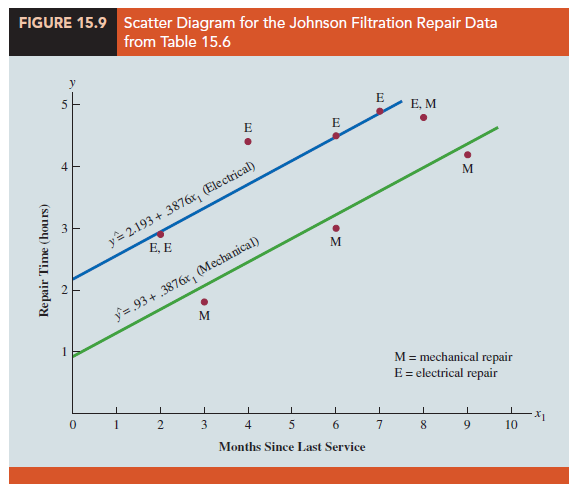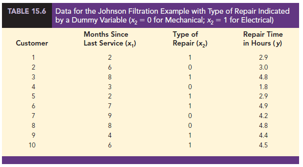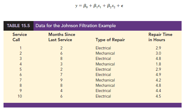Johnson Filtration, Inc., provides maintenance service for water-filtration systems throughout southern Florida. Customers contact Johnson with requests for maintenance service on their water-filtration systems. To estimate the service time and the service cost, Johnson’s managers want to predict the repair time necessary for each maintenance request. Hence, repair time in hours is the dependent variable. Repair time is believed to be related to two factors, the number of months since the last maintenance service and the type of repair problem (mechanical or electrical). Data for a sample of 10 service calls are reported in Table 15.5.