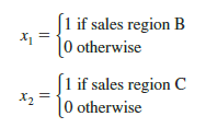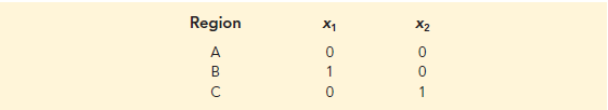 Observations corresponding to region A would be coded Xj = 0, x2 = 0; observations corresponding to region B would be coded x1 = 1, x2 = 0; and observations corresponding to region C would be coded x1 = 0, x 2 = 1.