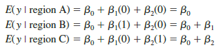 Thus, β0 is the mean or expected value of sales for region A; β1 is the difference between the mean number of units sold in region B and the mean number of units sold in region A; and β2 is the difference between the mean number of units sold in region C and the mean number of units sold in region A.