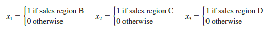 Two dummy variables were required because sales region is a categorical variable with three levels. But the assignment of x1 = 0, x2 = 0 to indicate region A, x1 = 1, x2 = 0 to indicate region B, and x1 = 0, x2 = 1 to indicate region C was arbitrary. For example, we could have chosen x1 = 1, x2 = 0 to indicate region A, x1 = 0, x2 = 0 to indicate region B, and x1 = 0, x2 = 1 to indicate region C. In that case, β1 would have been interpreted as the mean difference between regions A and B and β2 as the mean difference between regions C and B.