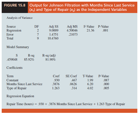 Figure 15.8 shows that both months since last service (p-value = .000) and type of repair (p-value = .005) are statistically significant. In addition, R-Sq = 85.92% and R-Sq (adj) = 81.9% indicate that the estimated regression equation does a good job of explaining the variability in repair times. Thus, equation (15.17) should prove helpful in predicting the repair time necessary for the various service calls.