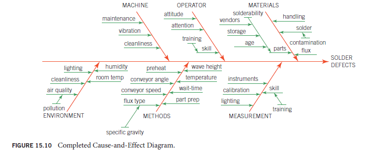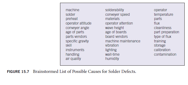 The group is told that the issue to be discussed is the solder defect rate and that the objective is to list all the factors in the process that could possibly have an impact on the defect rate. The group uses brainstorming to generate the list of possible causes. The list might look like Figure 15.7.
