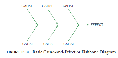 A team typically uses a cause-and-effect diagram (see Figure 15.8) to identify and isolate causes of a problem. The technique was developed by the late Dr. Ishikawa, a noted Japanese quality expert, so sometimes the diagram is called an Ishikawa diagram. It is also often called a fishbone diagram because that is what it looks like.