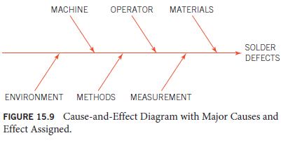The designated six major factors, or causes, are those that the group thinks might have an impact on the quality of output of the machine soldering process: machine, operator, materials, methods, measurement, and environment. The cause-and-effect fishbone diagram developed from this information has six ribs, as shown in Figure 15.9.