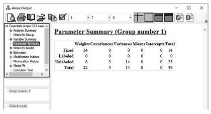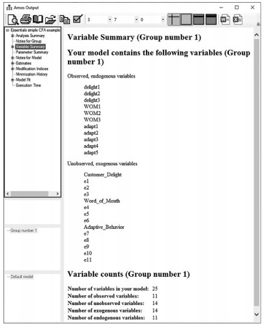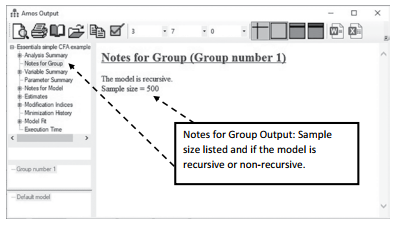 button.This icon looks similar to the data file icon; make sure you choose the right one. Once selected, the output will come up in a separate window.You can see on the left-hand side links to different output results. The first link is “Analysis Summary”, and this just gives the time and date of analysis (not that useful). The next link is “Notes for Group”. This link will state your sample size and if the model is recursive or non-recursive. In a CFA, you should never have a non-recursive model. More information on what a non-recursive model is appears on page 310.