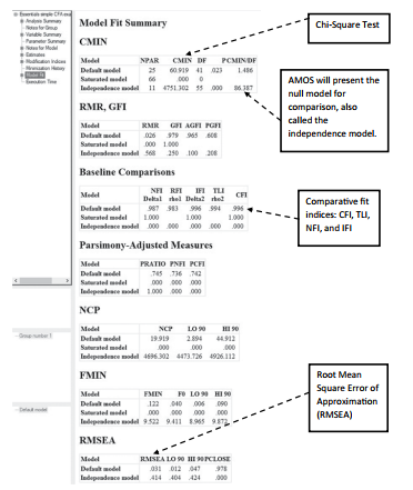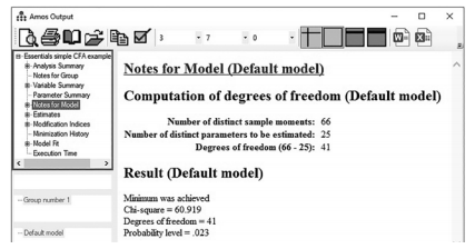 Next is the “Notes for Model” link; this will list your degrees of freedom in your model along with the chi-square test.The Notes for Model output will also be where AMOS presents error messages if your model does not run to completion.