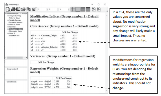Below the Estimates tab in the output is the “Modification Indices” tab (you will see this tab only if you requested this in the Analysis Properties Window). The values listed are modifica- tions for possible covariances and also modifications if a regression weight (path) was added. With the covariances data, the M.I. value is how much the chi-square value would decrease if you added the covariance. The second column “Par Change” is how much a parameter would change if this covariance was added. See Figure 4.17.