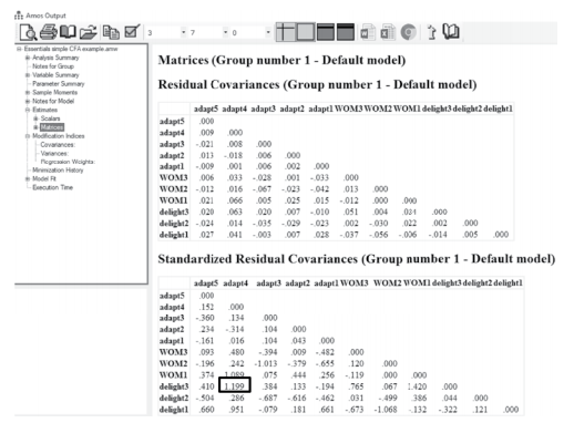 Along with modification indices,AMOS also provides a test of model misspecification through standardized residuals. The standardized residuals are the difference between the observed covariance matrix and the estimated covariance matrix for each pair of observed variables. You will specifically need to request for this information to be presented in the analysis of a SEM model. In the Analysis Properties Window, you will see a tab called “Output” and at the bottom of the window is a checkbox option for “Residual Moments”. You will need to select this box to see the Standardized Residuals in the analysis. After running the analysis, you will need to go into the output under the Estimates link and then select the Matrices option. AMOS will provide you with the unstandardized and standardized residuals, but only the standardized residuals need to be examined. Because the data is standardized, the unit of measurement is transformed to allow for easier comparison. If a residual value exceeds 2.58, then the residual of the observed and estimated covariance matrix is determined to be large (Joreskog and Sorbom 1988) and a sign of possible model misspecification. In the example output (see Figure 4.18), you can see that the biggest residual is 1.199, the difference of delight3 and adapt4.These indicators are across constructs, so no adjustment would be made in this instance. If the high residual value was within construct, then you would consider add- ing a covariance between the constructs’ error terms.