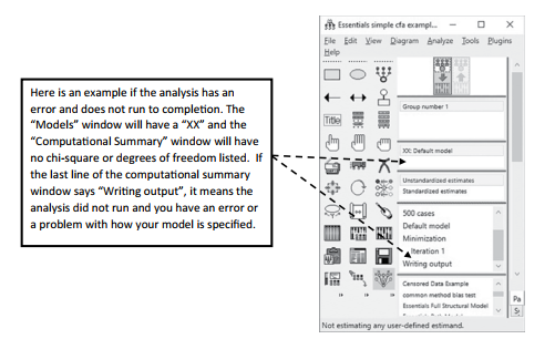 . Once the analysis is complete, you will see either an “OK” or “XX” in the “models” window. An “OK” means the model ran to completion; a “XX” means there is an error and the analysis did not finish. If an analysis is completed, you will also see the chi-square and degrees of freedom listed in the “Computational Summary” window.
