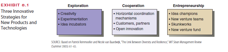 trated in Exhibit 8.1.7 The first strategy, exploration, involves designing the organization to encourage creativity and the initiation of new ideas. The strategy of cooperation refers to cre- ating conditions and systems to facilitate internal and external coordination and knowledge sharing. Finally, entrepreneurship means that managers put in place processes and structures to ensure that new ideas are carried forward for acceptance and implementation.