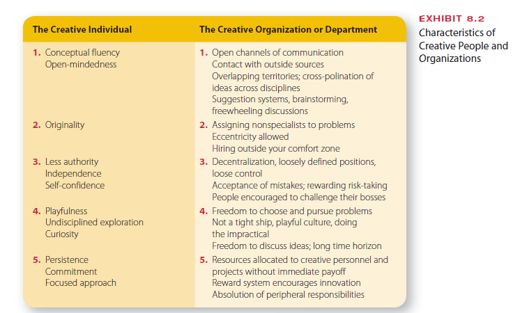 Characteristics of highly creative people are illustrated in the left-hand column of Exhibit 8.2. Creative people often are known for originality, open-mindedness, curiosity, a focused approach to problem solving, persistence, a relaxed and playful attitude, and receptivity to new ideas.9 Creativity can also be designed into organizations. Companies or departments within companies can be organized to be creative and initiate ideas for change. Most compa- nies want more highly creative employees and often seek to hire creative individuals. However, the individual is only part of the story, and each of us has some potential for creativity. Manag- ers are responsible for creating a work environment that allows creativity to flourish.10