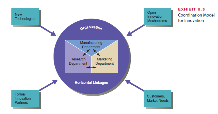 One approach to successful innovation is called the horizontal linkage model, which is illustrated in the center circle of Exhibit 8.3.23 The model shows that the research, manu- facturing, and sales and marketing departments within an organization must simultane- ously contribute to new products and technologies. People from these departments meet frequently in teams and task forces to share ideas and solve problems. For example, re- search people inform marketing of new technical developments to learn whether they will be useful to customers. Marketing people pass customer complaints to research to use in the design of new products and to manufacturing people to develop new ideas for improv- ing production speed and quality. Manufacturing informs other departments concerning whether a product idea can be manufactured within cost limits.