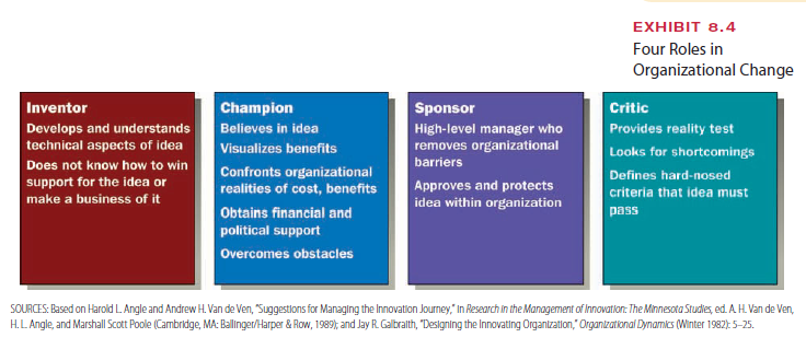 Championing an idea successfully requires roles in organizations, as illustrated in Exhibit 8.4. Sometimes a single person may play two or more of these roles, but successful innovation in most companies involves an interplay of different people, each adopting one role. The inventor comes up with a new idea and understands its technical value but has neither the ability nor the interest to promote it for acceptance within the organization. The champion believes in the idea, confronts the organizational realities of costs and benefits, and gains the political and fi- nancial support needed to bring it to reality. The sponsor is a high-level manager who approves the idea, protects the idea, and removes major organizational barriers to acceptance. The critic counterbalances the zeal of the champion by challenging the concept and providing a reality test against hard-nosed criteria. The critic prevents people in the other roles from adopting a bad idea.40 Reed Hastings was inventor, champion, and critic all in one, as is often the case in small-business startups, as described in the Benchmarking box.