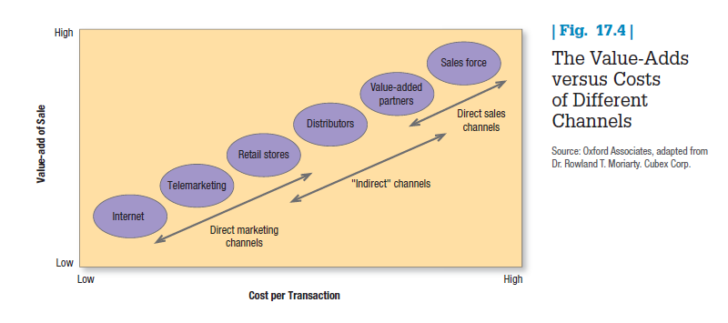 ECONOMIC CRITERIA Every channel member will produce a different level of sales and costs. Figure 17.4 shows how six different sales channels stack up in terms of the value added per sale and the cost per transaction. For example, in the sale of industrial products costing between $2,000 and $5,000, the cost per transaction has been estimated at $500 (field sales), $200 (distributors), $50 (telesales), and $10 (Internet). A Booz Allen Hamilton study showed that at one time the average transaction at a full-service branch cost a bank $4.07, a phone transaction $.54, and an ATM transaction $.27, but a typical online transaction cost only $.01.41