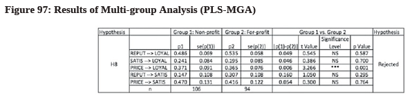 A multi-group analysis (PLS-MGA) is conducted using the parametric approach106 as suggested by Keil et al., (2000). This way, Susan can explore if there is any categorical moderating effect of business type (i.e., non-profit = group 1; for-profit = group 2) on her research findings. This kind of concern is understandable because heterogeneity may exist to show significantly differences in model relationships. Becker, Rai, Ringle, & Volckner (2013) advise that researchers who failed to consider this potential issue may draw incorrect conclusions.
