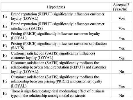 All of the hypotheses except two are accepted in Susan’s research, and their results are summarized in Figure 98. REPUT is found to have significant impact to both LOYAL and SATIS (H1 & H2), whereas PRICE significantly influences these two endogenous variables as well (H3 & H4). It has also been found that SATIS maintains a significant linkage to LOYAL (H5). Meanwhile, SATIS serves as a significant mediator to the relationship between PRICE and LOYAL (H7). There is no significant categorical moderating effect of the business type in the model so the last hypothesis (H8) is rejected.