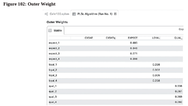 - On the Results Report, check the signs of the outer weight to see if they are positive or negative by going to “Final Results Outer Weights”. In general, we want positive values. If there are any indicators having negative values (e.g., those larger than-0.1), they should be removed prior to running IPMA. In our case, all values are positive (see Figure 102), so we can proceed with IPMA.