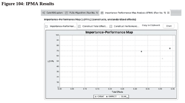 - To view IPMA result graphically, go to “Quality Criteria 9 Importance-Performance Map [LOYAL] (constructs, unstandardized effects)” on the Results Page (see Figure 104).