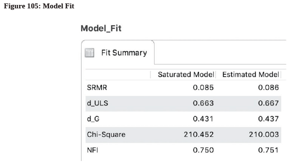- Under the “Estimated Model” column, you can now find the values for SRMR, dULS, and dG. for assessment using the guidelines as shown earlier in this section. In our model, we have an SRMR value of 0.086, which is slightly above the 0.08 threshold; this suggests a poor theoretical model fit.
