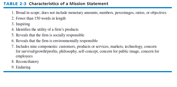 As indicated in Table 2-3, in addition to being broad in scope, an effective mission statement should not be too lengthy; recommended length is less than 150 words. An effective mission statement should arouse positive feelings and emotions about an organization; it should be inspiring in the sense that it motivates readers to action. A mission statement should be enduring. All of these are desired characteristics of a statement. An effective mission statement generates the impression that a firm is successful, has direction, and is worthy of time, support, and invest- ment—from all socioeconomic groups of people.