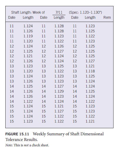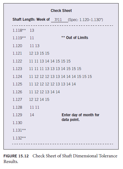 The purpose of the check sheet is to make it easy to collect data for specific purposes and to present it in a way that facilitates conversion from data to useful information. For example, suppose we are manufacturing parts that have a specified dimensional tolerance of 1.120 to 1.130 inches (in.). During the week, each part is measured and the data are recorded. Figure 15.11 is a summary of the week’s results.