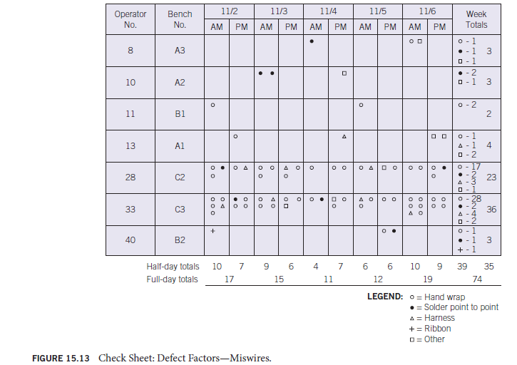 In the check sheet shown in Figure 15.13, five types of miswire defects, covering all types experienced, are coded by symbols, and these symbols are the only raw data entered on the chart. Sums of all defect categories are shown at the bottom of each column, and the weekly total for each operator is shown at the end of each row. A quick glance at the check sheet points to operators 28 and 33 as the sources of the problem. We don’t know the cause at this point, but we know where to start looking.